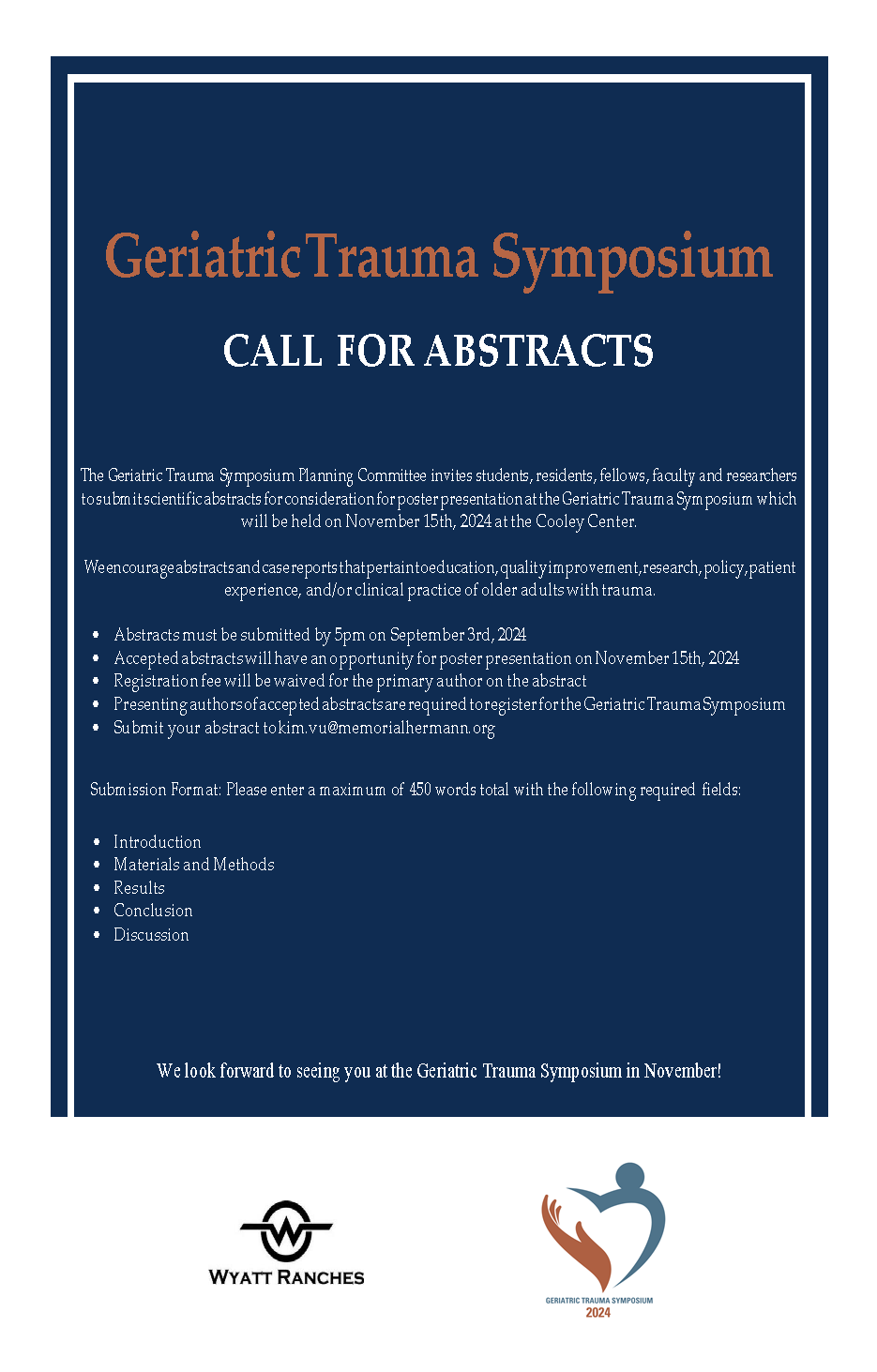 The Symposium Planning Committee also invites students, fellows, faculty, and researchers to submit scientific abstracts for consideration for poster presentation. Abstracts may be submitted to kim.vu@memorialhermann.org and are due no later than 5:00pm on September 3, 2024. “